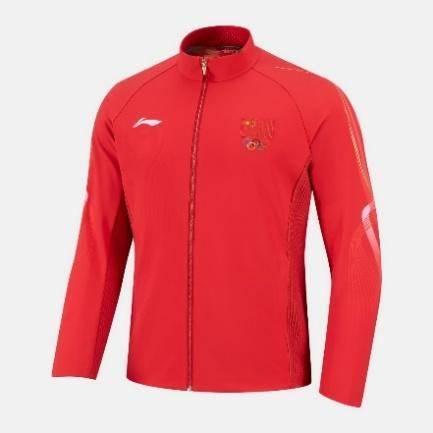 动员大会现场,中国体育代表团成员身着李宁品牌提供的专业运动装备亮相。此次的室内领奖服以“中国红”为主色调,主身与侧幅分别采用弹力经编面料及高弹肌理面料,使得整体挺阔舒适,展现运动员在领奖时刻的庄严与荣耀。拉头细节处巧妙采用中国传统吉祥寓意纹样“双胜纹”,该纹样由两个菱形交叠穿插而成,蕴含着胜利、祥瑞、同心共赢等美好寓意,并在此基础上衍生出“双胜雪花纹”,运用于后幅“CHINA”字母纹饰。袖肘处层叠向上的线条设计,灵感来源于冰刀划过赛道的轨迹,将冬季冰雪运动的动态美感融入设计之中,既勾勒出一往无前的速度之美,更彰显着运动员驰骋赛场的拼搏精神。